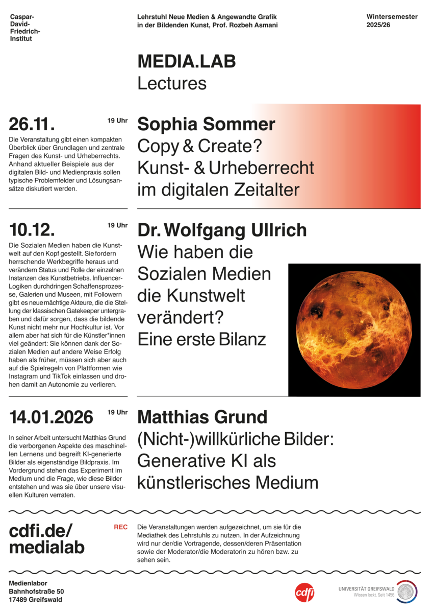 Studieren am Caspar-David-Friedrich-Institut in Greifswald bedeutet, sich an einer kleinen und traditionsreichen Universität mit Kunst und Wissenschaft auseinander zu setzen. Das Caspar-David-Friedrich-Institut der 1456 gegründeten Universität geht in seinen Anfängen auf den im 18. Jahrhundert entstandenen akademischen Zeichensaal zurück, der seit 1788 unter der Leitung von Johann Gottfried Quistorp stand. Er bildete gewissermaßen das Fundament bzw. den Ausgangspunkt für das Caspar-David-Friedrich-Institut. In diesem Zeichensaal lernte übrigens auch Caspar David Friedrich, der Namensgeber des heutigen Instituts. Bereits 1907 gründete man das Seminar für Kunstgeschichte, 1946 folgte dann das Institut für Kunstpädagogik. 2001 wurden die Bachelor- und Masterstudiengänge für Bildende Kunst (Fine Arts) und Kunstgeschichte eingerichtet.